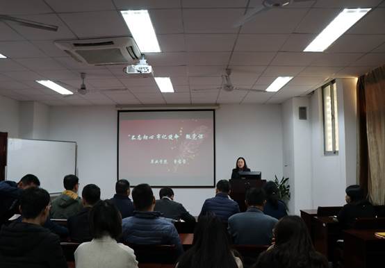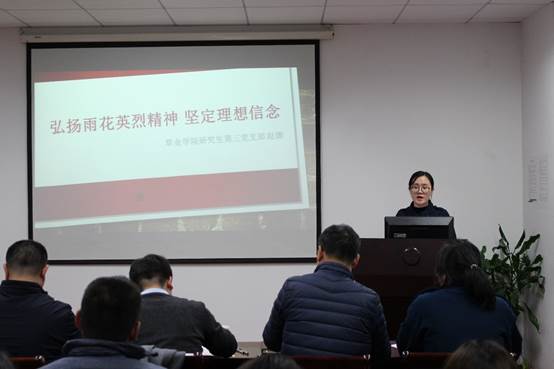 赵娜老师以“弘扬精神雨花英烈,坚定理想信念”为题讲述了雨花台的故事。1927-1949年间的雨花台,成千上万的英烈牺牲于此,他们拥有为人民牺牲的大无畏精神,有革命必将胜利的坚定信念。赵娜老师以多个英烈为例,鼓励党员以雨花英烈为榜样,把人生追求与社会目标相同一,把个人命运与国家命运紧密的联系在一起,真正的情怀知于心,践于行。