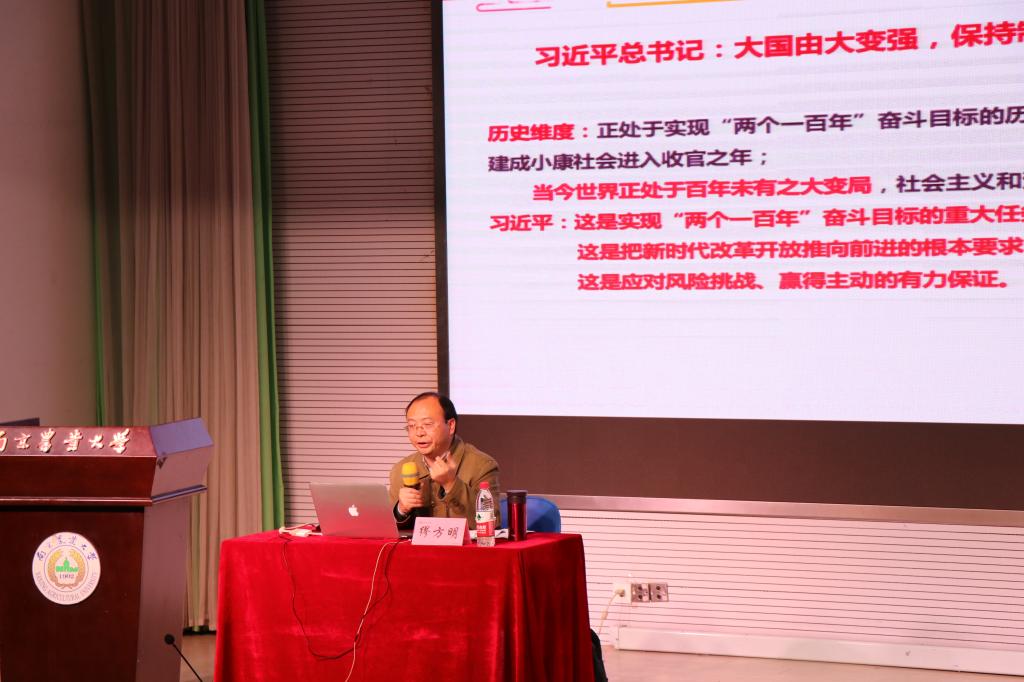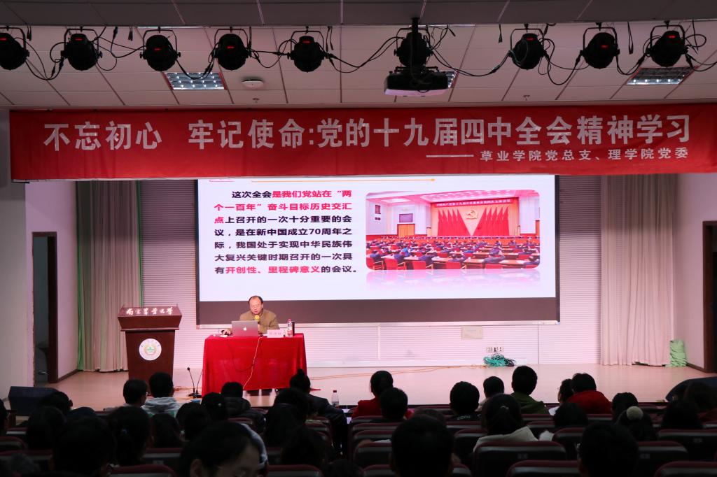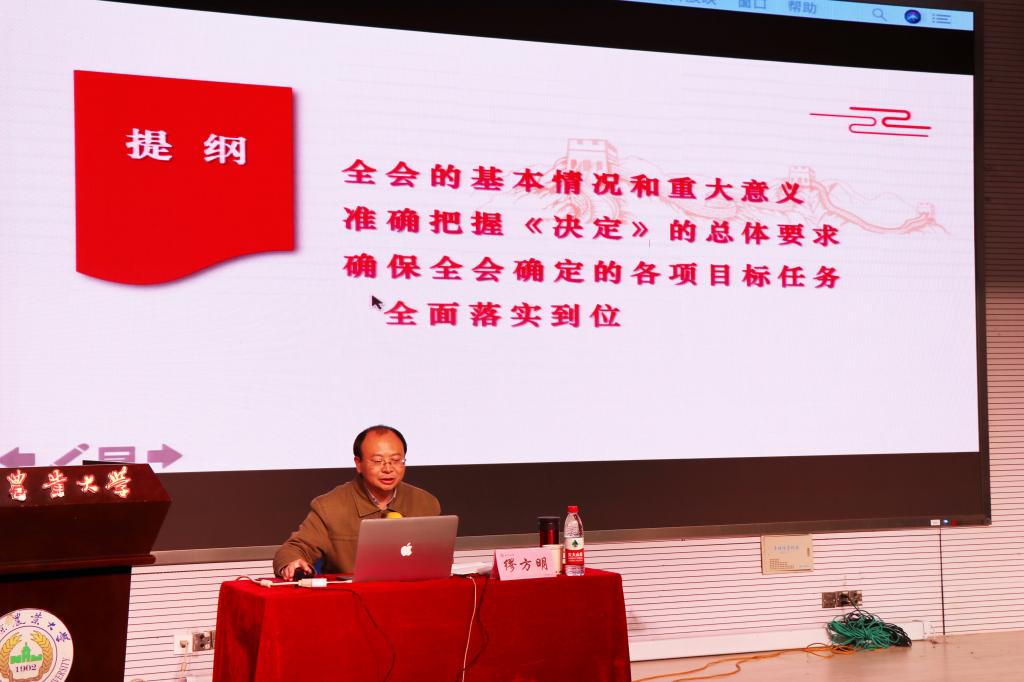党总支、理学院党委于12月18日共同举办“不忘初心、牢记使命:党的十九届四中全会精神”宣讲会,特邀请马克思主义学院道德与法教研室主任缪方明副教授主讲。两院共200余名师生参加了宣讲会。