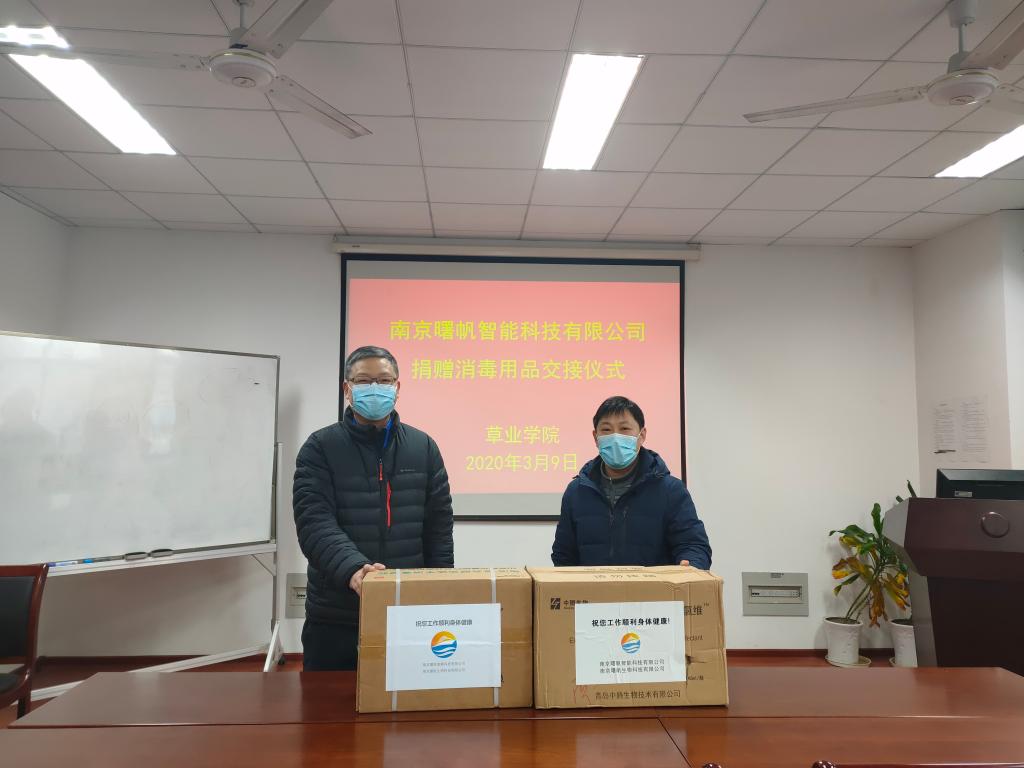 ,向学院送上捐赠的消毒用品:葡清复合醇免洗手消毒凝胶和氯维液体喷剂各一箱。麻豆视频