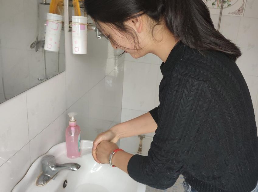 伏秀珍也结束了当天的值班。此时的她正在洗手,认真做好洗手的七个步骤:内、外、夹、弓、大、立、腕,养成良好的居家卫生习惯。
