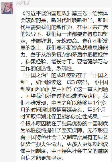 研究生第三党支部召开了2020-2021上半学年第三次专题学习会,会议主要结合《习近平谈治国理政》第三卷第三章,对《中国制度面对面》进行解读学习。会议由支部书记赵娜主持,开展采取线上线下相结合的方式,校外实践的党支部成员通过腾讯会议线上参与,线下书记同在校党员同志共同于理科南楼F304会议室参加会议。