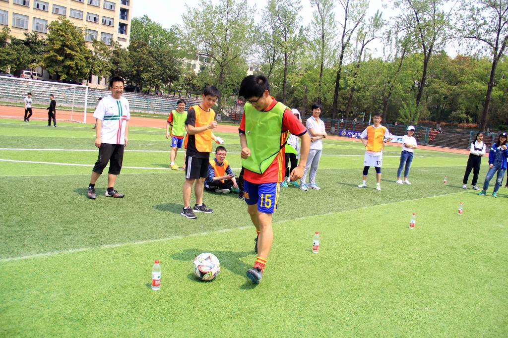 中场休息期间进行了趣味赛环节,在场所有同学都参与其中,被随机分为五组开展游戏。趣味赛由带球绕桩、足球保龄球、和足球九宫格三个环节组成,颇具创意的接力赛赛制激发了在场所有同学的激情,气氛轻松愉快,最终第五组以最短的时间赢得了趣味赛环节的胜利。