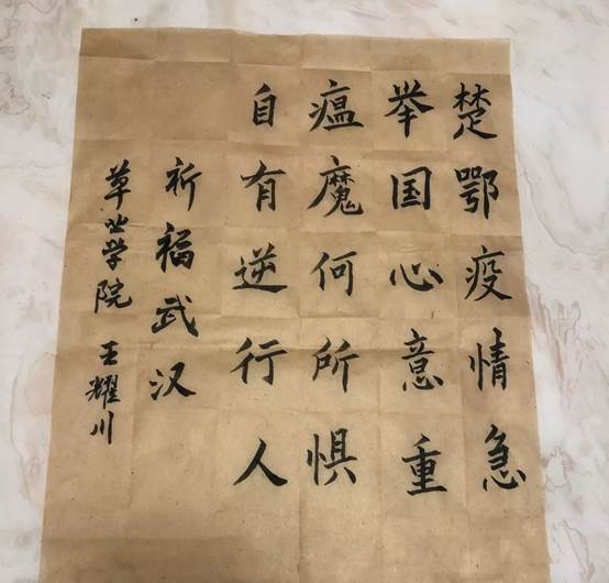 作品说明:在疫情防控过程中,高校大学生是一个不容被忽视的群体。作为主人公的我们,在此时期,应主动担当起责任,发展自身素质。心中祈福武汉,身体力行,特作诗并书写,默默祈福……