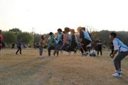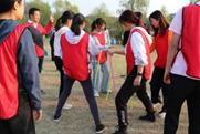 管老师先是用一个小游戏带动了大家的氛围,然后将所有人分为了红、粉、蓝三组,还分发了相应颜色的小马甲,每个小组还展示了各自的队旗、口号和队歌。随即开始进行正式活动。活动分为三个项目:一、雷区取瓶;二、同心鼓;三、决胜150。