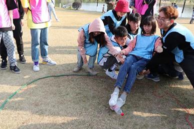 游戏开始时,每组所有人都上场,每个人拉着鼓的一根绳子,每个队员牵拉一根绳子,保证鼓面水平。同时另选出一名队友将一个排球从鼓面中心上方竖直抛下,队员们齐心协力将球颠起,颠球次数最多者胜出,颠的次数最少的组享受抽签惩罚。该项目非常考验团队协作能力,需要每个人的通力配合,最后大家的成绩都很不错,最高的组颠了118次。同心鼓项目还引来附近小朋友的热烈加油,现场气氛燃到极点。