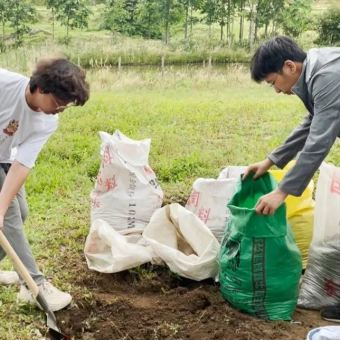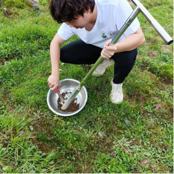 在确定下退化草地的修复样地后,两位同学跟随师兄师姐前去采集土样,之后带回实验室用于布置盆栽实验 ,从样地中挖回的土壤会先后进行过筛、翻混、装盆后,在其基础上设计不同的实验处理,以获得更加完善的结果。