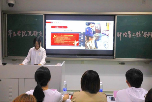 刘明慧同学汇报的主题是“我辈为民兼为国,拼将热血洒红毡”,并从年度工作回顾、特色活动展示、工作成果展示、存在问题分析四个方面分别介绍了草业222团支部的工作成果,其中“校园寻芳草,芳草识故人”革命先辈剪影剪贴画活动既凸显了草业学科特色,又加深了同学们的红色认知度和专业认同感。
