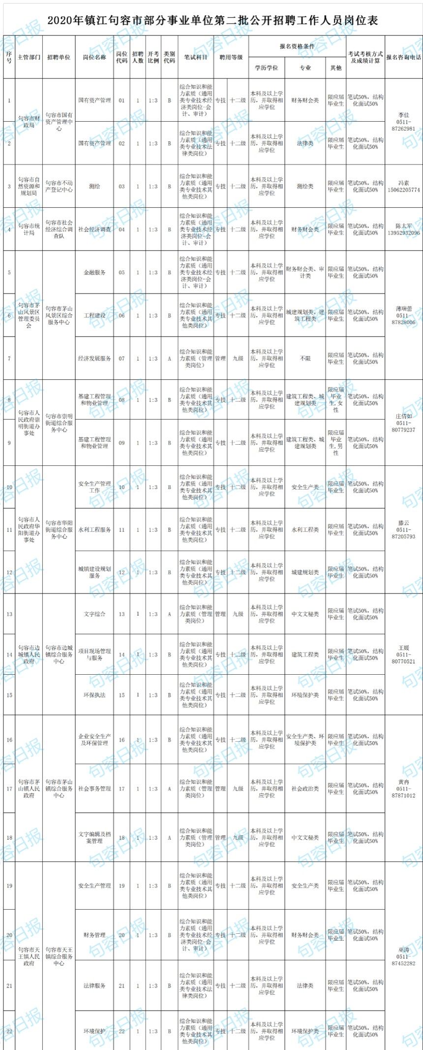 根据《事业单位公开招聘人员暂行规定》(人事部第6号令)、《江苏省事业单位公开招聘人员办法》(苏办发〔2020〕9号)精神,结合事业单位岗位空缺情况和工作需要,句容市部分事业单位面向社会公开招聘40名工作人员。