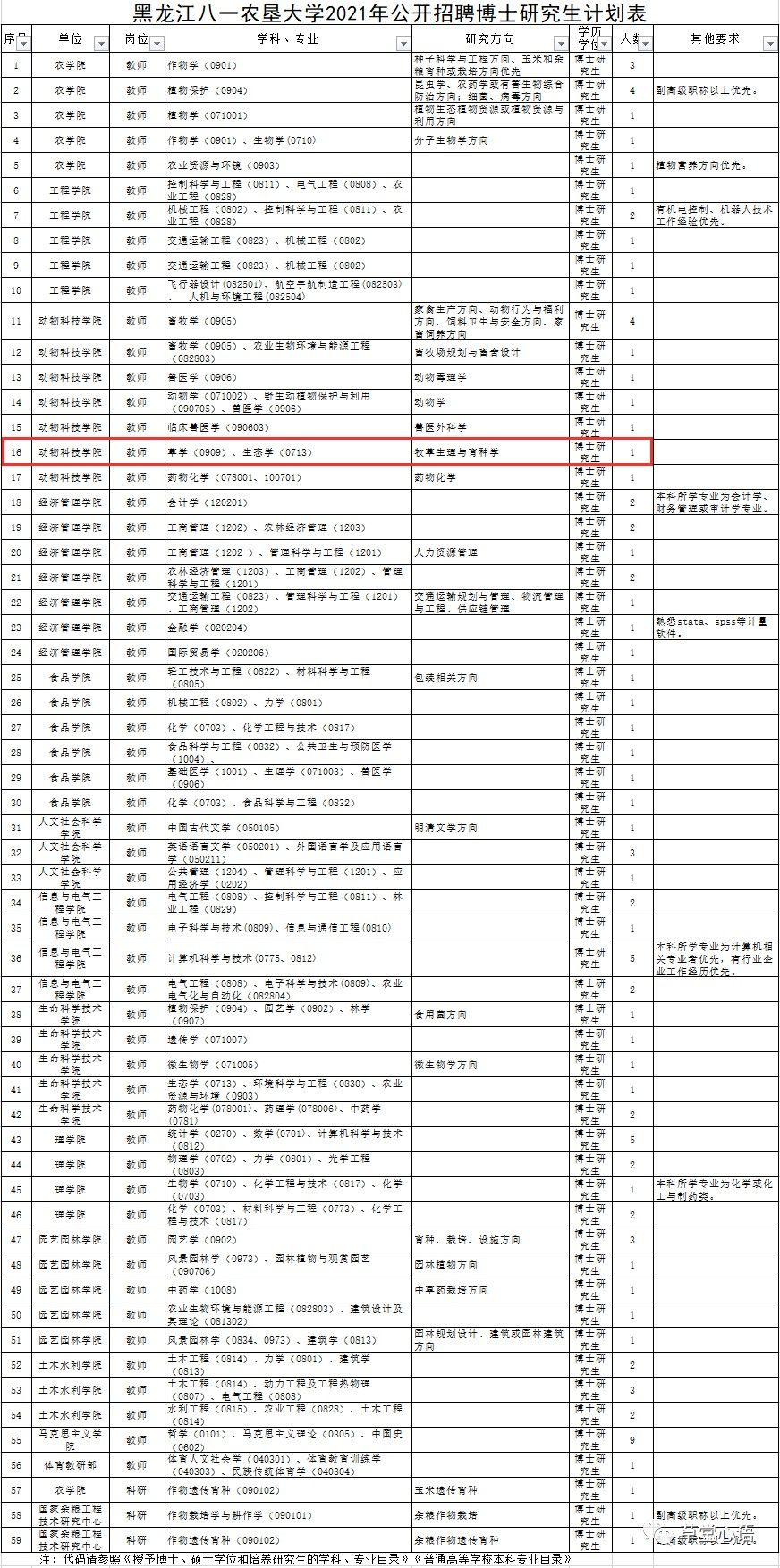 《黑龙江八一农垦大学2021年公开招聘博士研究生计划表》(附件1